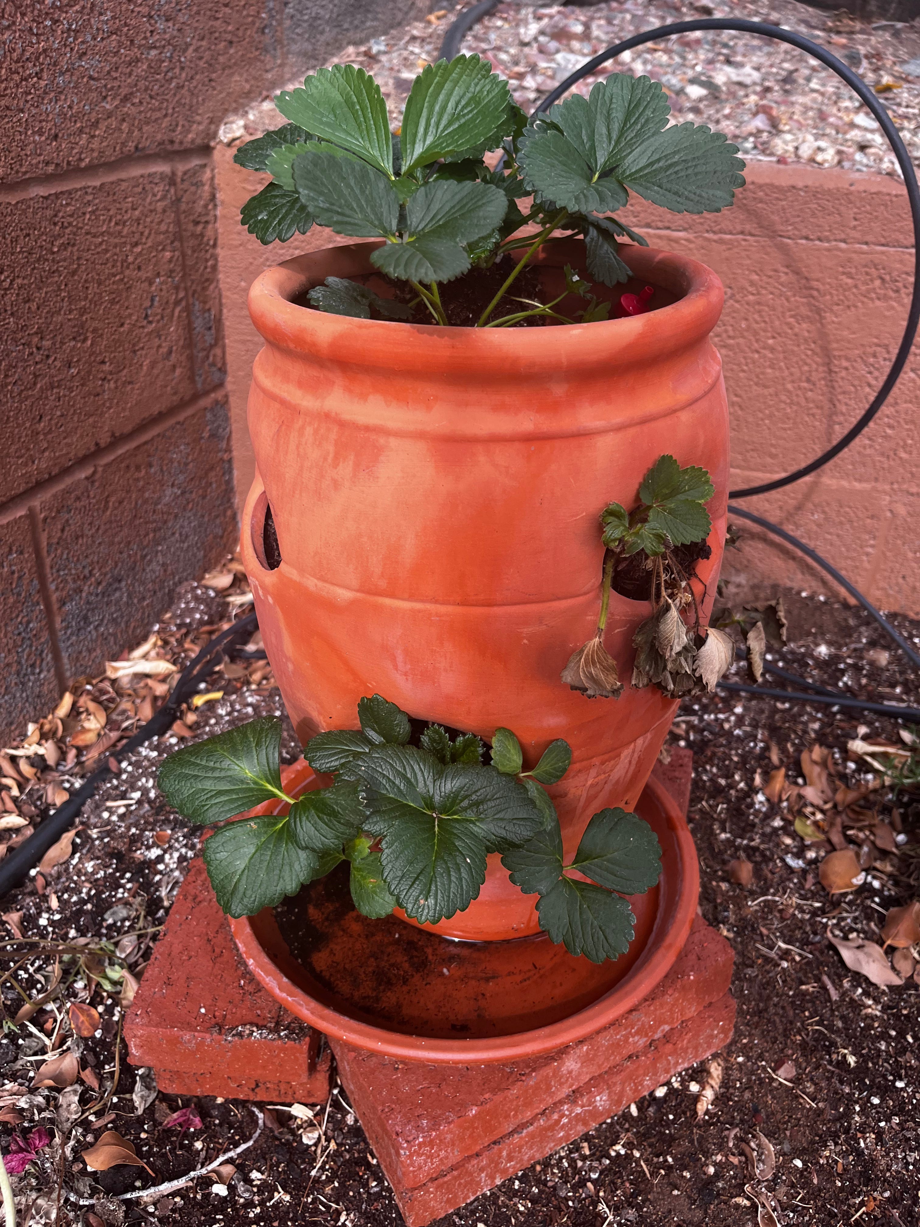 Now, I made a mistake already in my spring gardening. I planted a lot of starts in pots with a soil that is known for fungus gnats. Now I could have spent a lot of time and effort treating the fungus gnats, but it seemed easier on my body to plant directly into the garden bed instead. So you’ll notice that on the right-hand side of this strawberry pot, it looks like some wilted or even dead parts of a strawberry plant. I left this in the picture to show that not everything goes as planned, and that’s ok. However, many of the strawberry starts survived being transplanted from the pot into this planter.